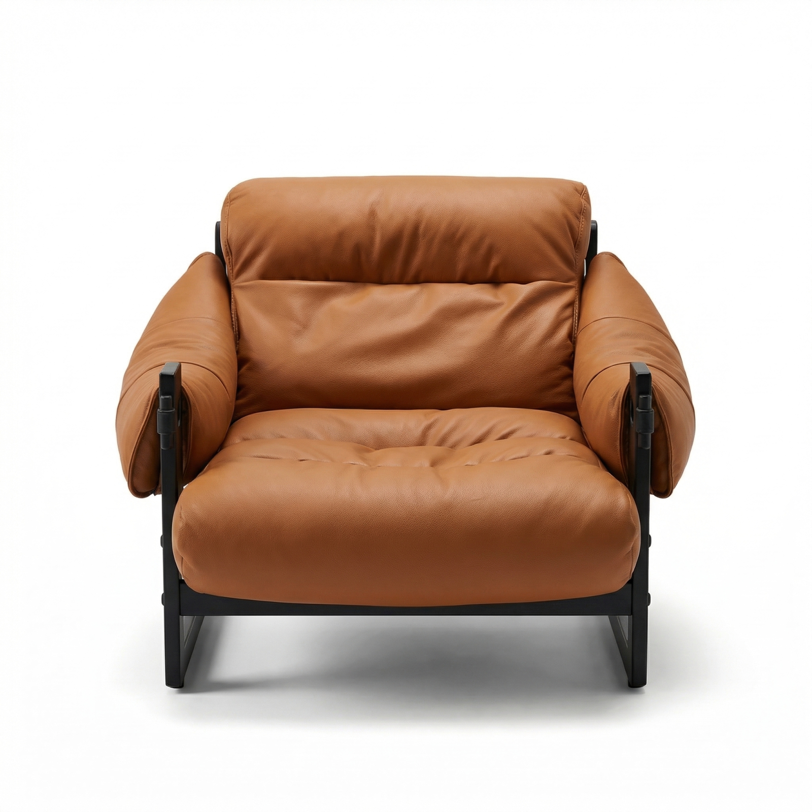 Designul fotoliului este caracterizat de forme bine proporționate, cu șezut amplu și spătar ergonomic, oferind un nivel ridicat de confort atât pentru relaxare, cât și pentru zone de lucru sau lectură. Brațele robuste și cadrul vizibil din lemn contribuie la un look echilibrat între stil industrial și modern premium.